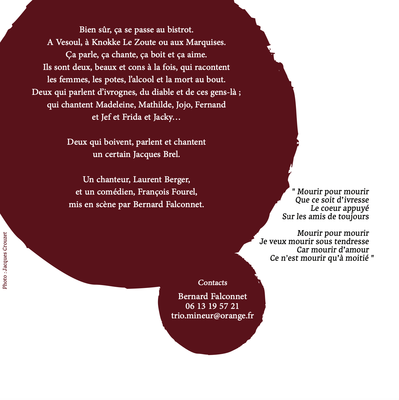 Un chanteur, Laurent Berger, et un comédien, François Fourel, mis en scène par Bernard Falconnet.