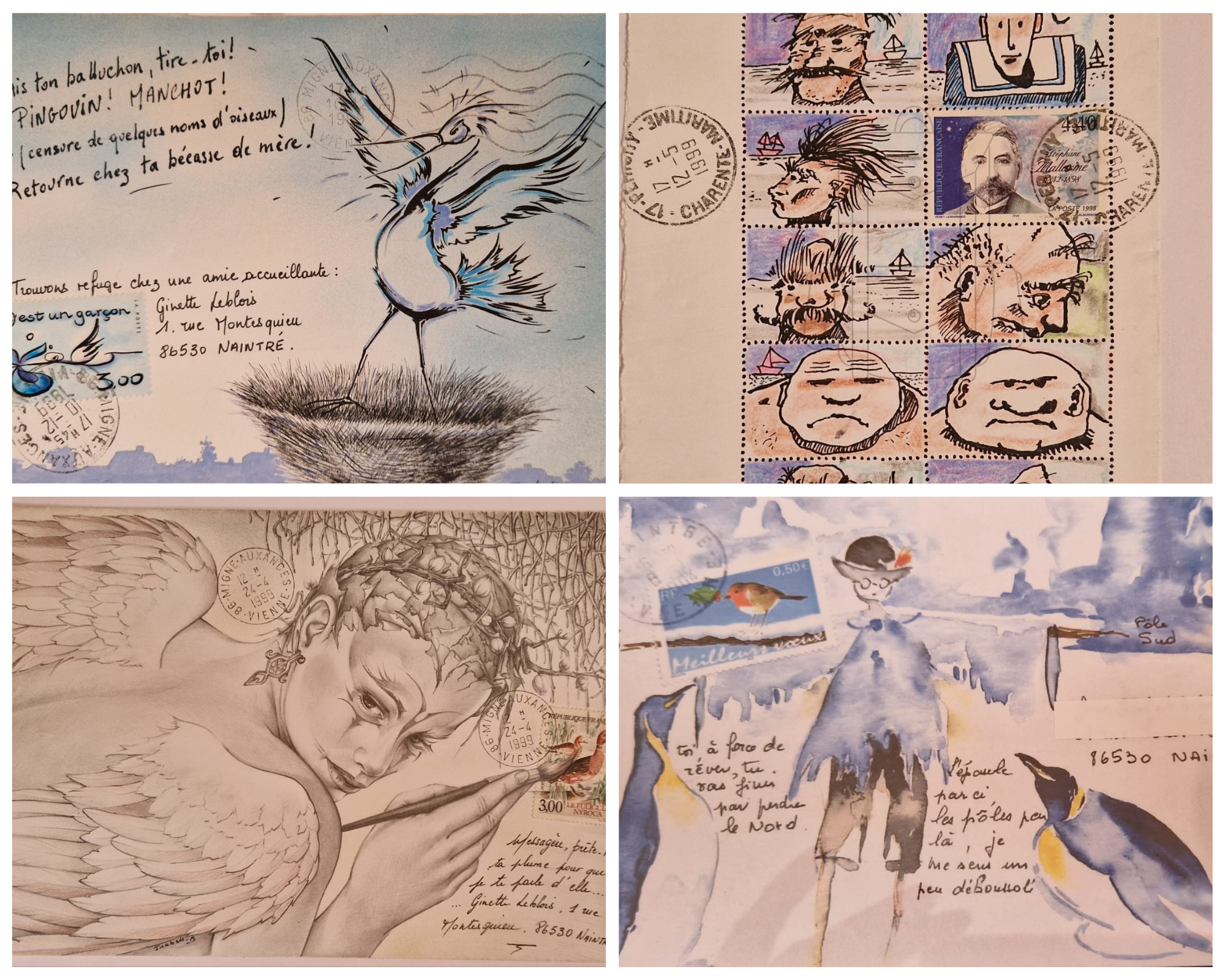 Ginette Leblois nous offre à découvrir des années d’enveloppes décorées -et un objet postal non identifié- envoyés à ses proches qui les lui ont restitués à l’occasion de cette exposition exceptionnelle.